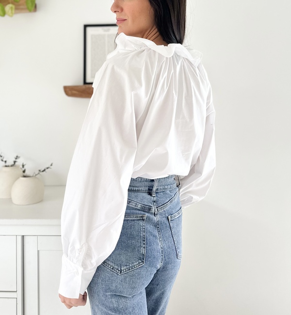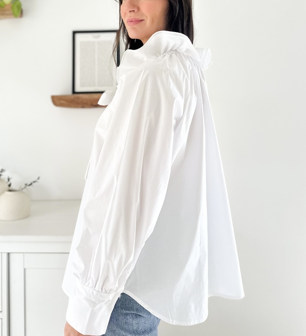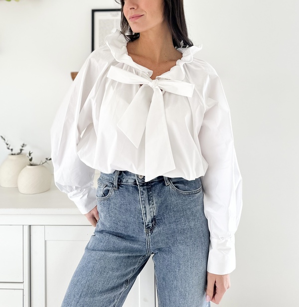 Blouse blanche Col fleur et liens à nouer Manches longues Coupe oversize