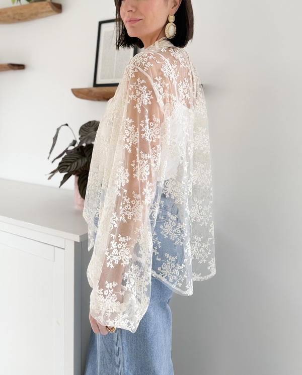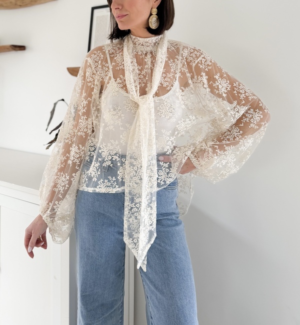 Bouse transparante brodée Manches longues et amples Col montant Débardeur non inclus