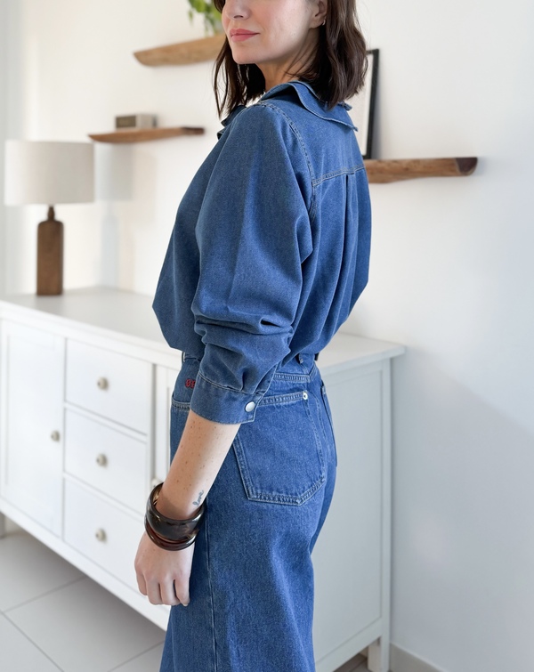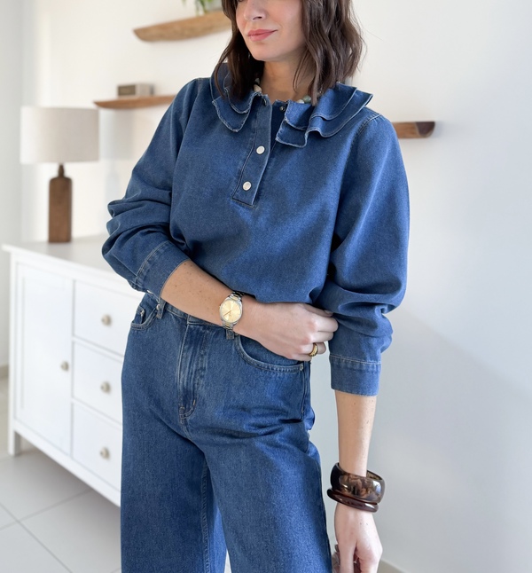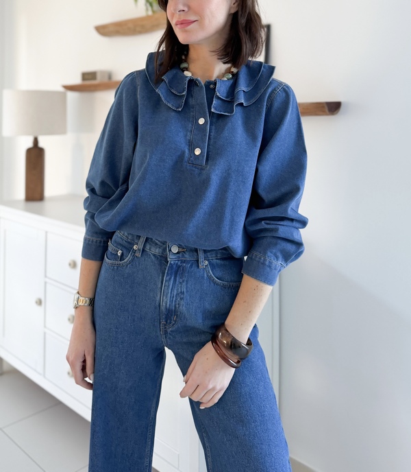 Blouse en denim bleu Manches longues Col rond à deux volants