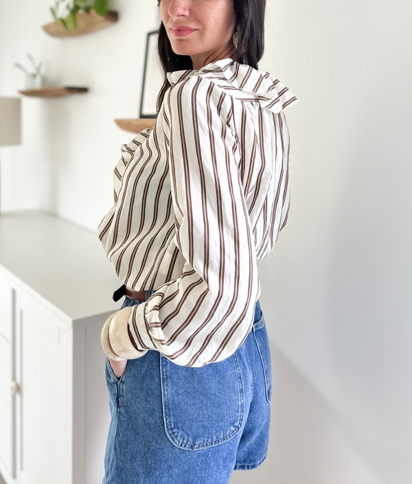 Blouse à manches longues Encolure ronde avec volant froncé Rayures marron choco sur fond beige Coupe légèrement oversize