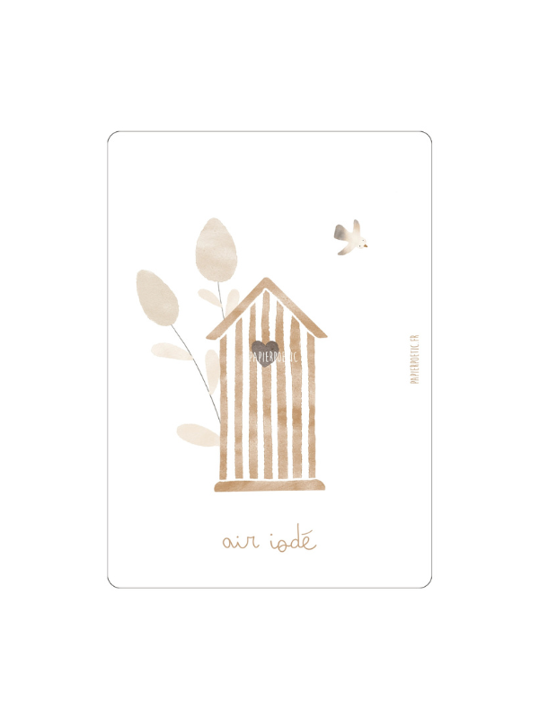 Carte « Cabane de plage », créées, imprimées et préparées en France. Impression sur Papier Aquarelle 300g, format A6 avec coins arrondis. Livrée avec enveloppe recyclée kraft et pochette protectrice.