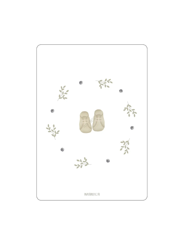 Carte « Couronne Chaussons Sauge » créées, imprimées et préparées en France. Impression sur Papier Aquarelle 300g, format A6 avec coins arrondis. Livrée avec enveloppe recyclée kraft et pochette protectrice.