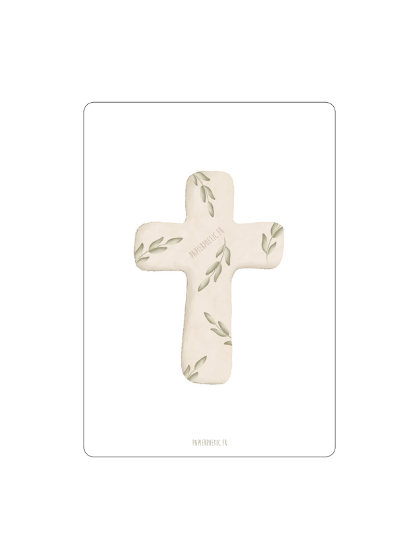 Carte « Croix Feuillage », créées, imprimées et préparées en France. Impression sur Papier Aquarelle 300g, format A6 avec coins arrondis. Livrée avec enveloppe recyclée kraft et pochette protectrice.