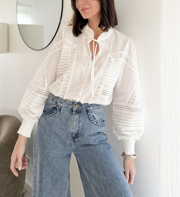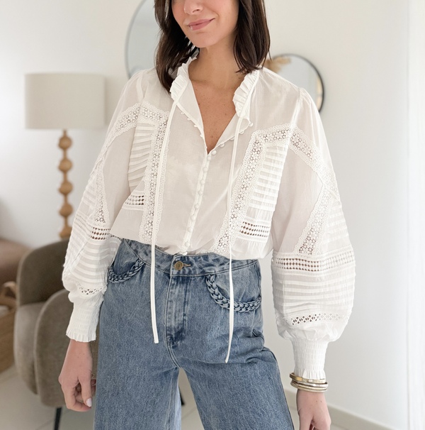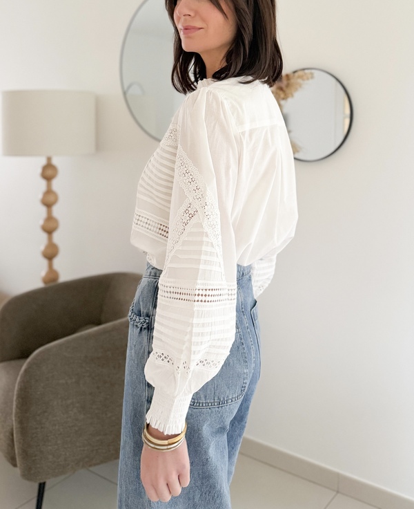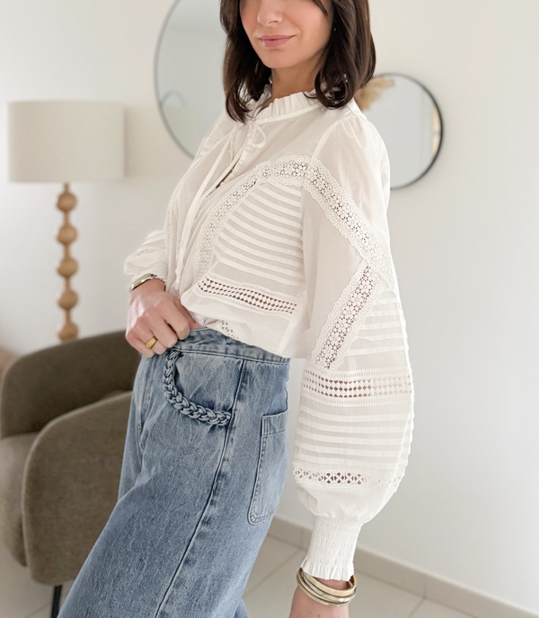 Chemise blanches à manches longues Encolure ronde Fermeture par boutons recouverts Poignets smockés Bandes brodées sur le devant et sur les manches