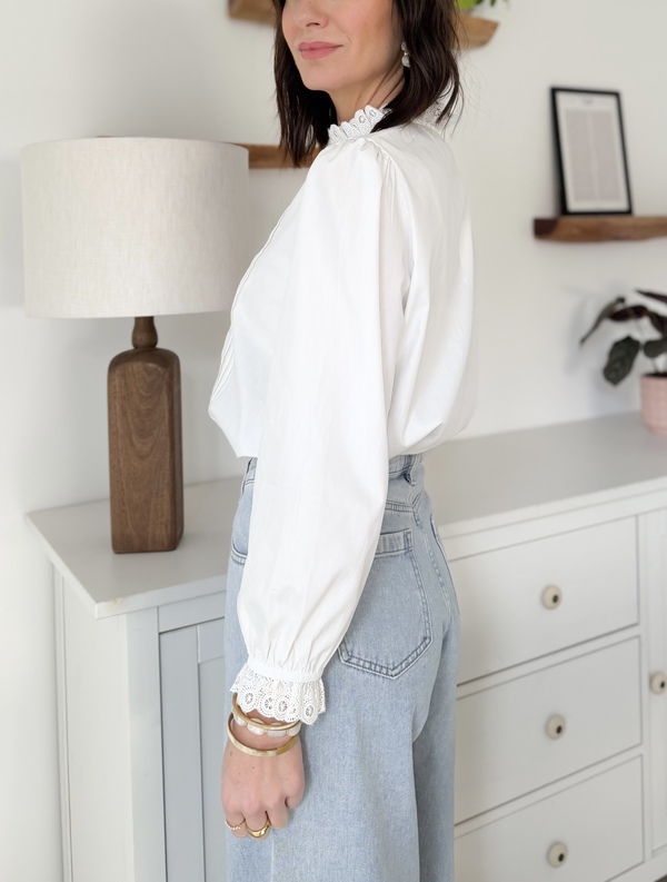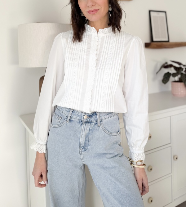 Chemise blanche Détails plissés sur le devant Manches longues Volants brodés sur le col et les poignets