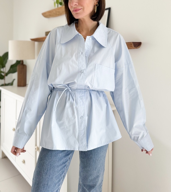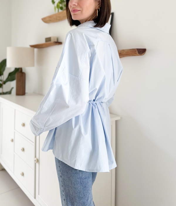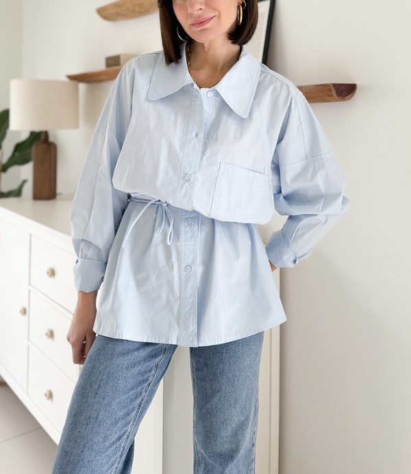 Chemise bleue ciel À nouer à la taille Manches longues Col classique Poche plaquée avant gauche