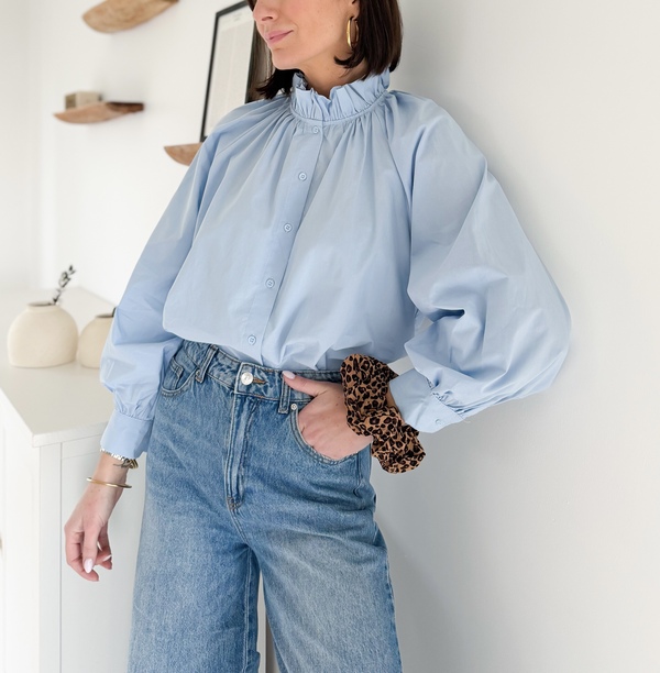 Chemise bleue Col victorien Manches longues Entièrement boutonnée