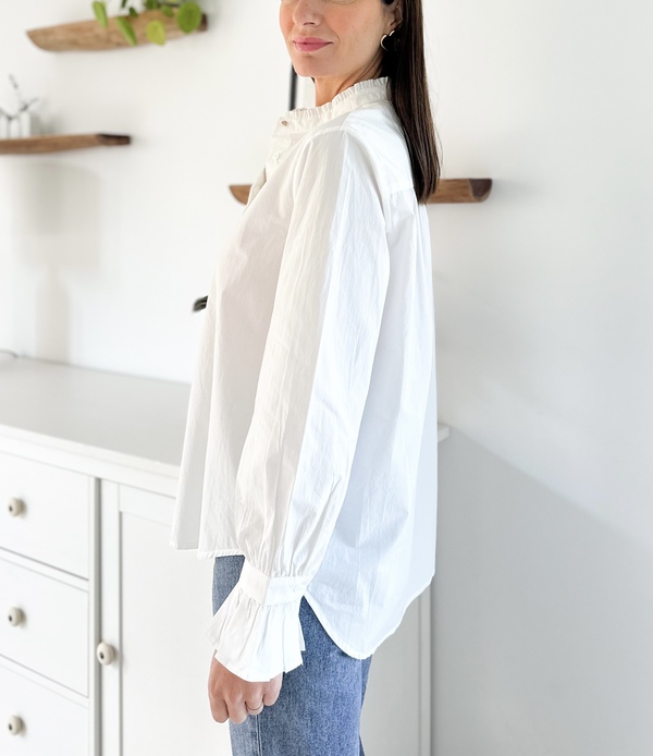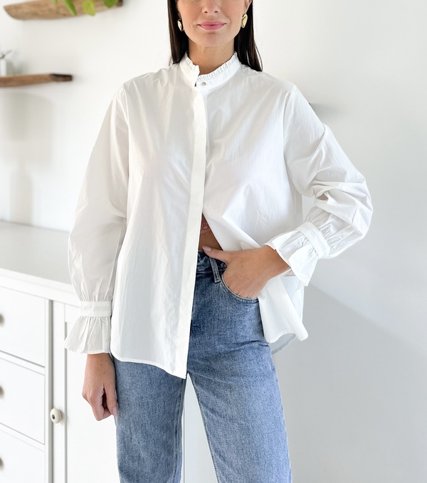 Chemise blanche à manches longues Col montant froncé Manches resserées