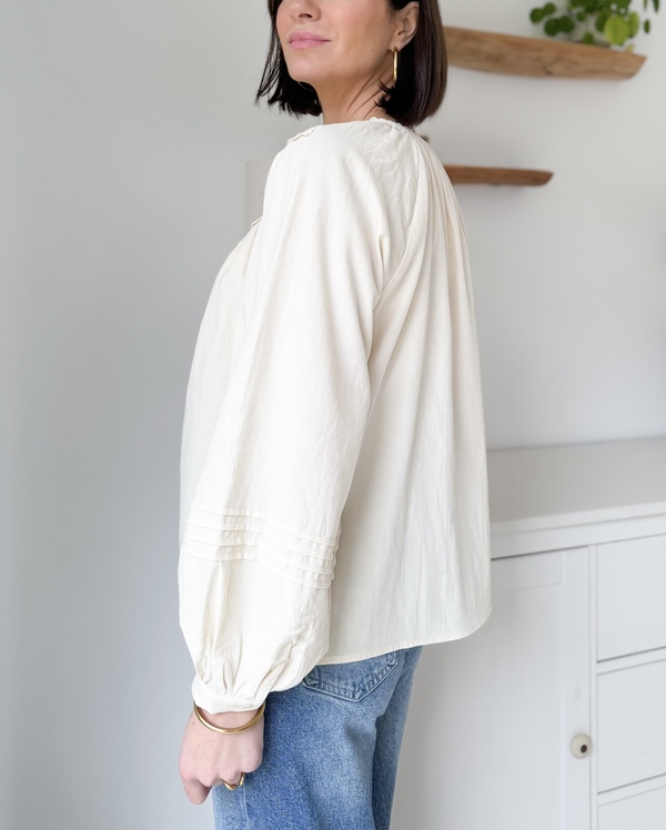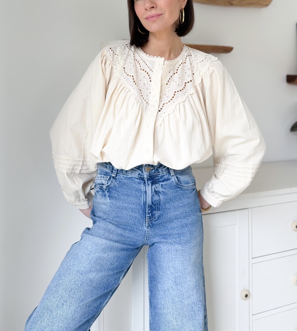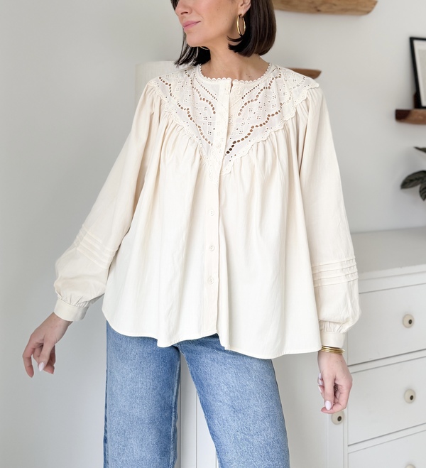 Chemise écrue à manches longues Manches ballon Entièrement boutonnée Encolure ronde Empiècement brodée sur le devant