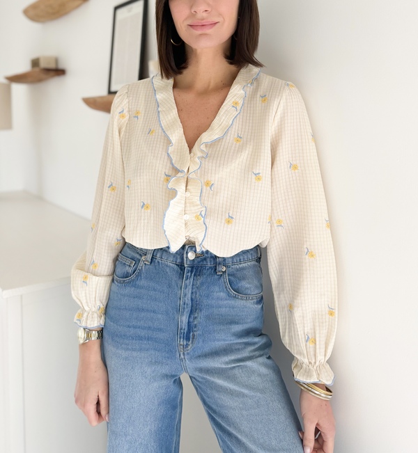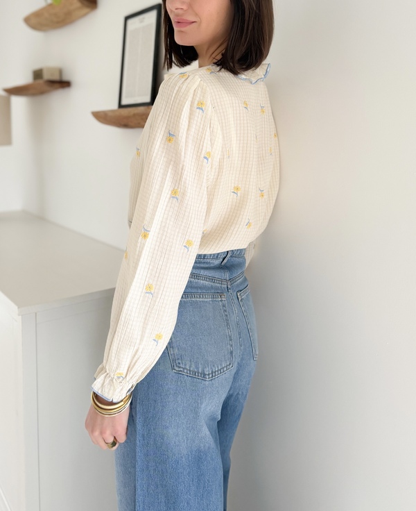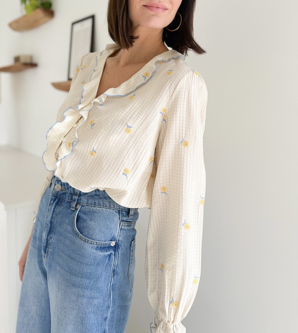 Chemise fluide à fleurs brodées Manches longues Volants sur le devant Poignets ressérés par un élastique