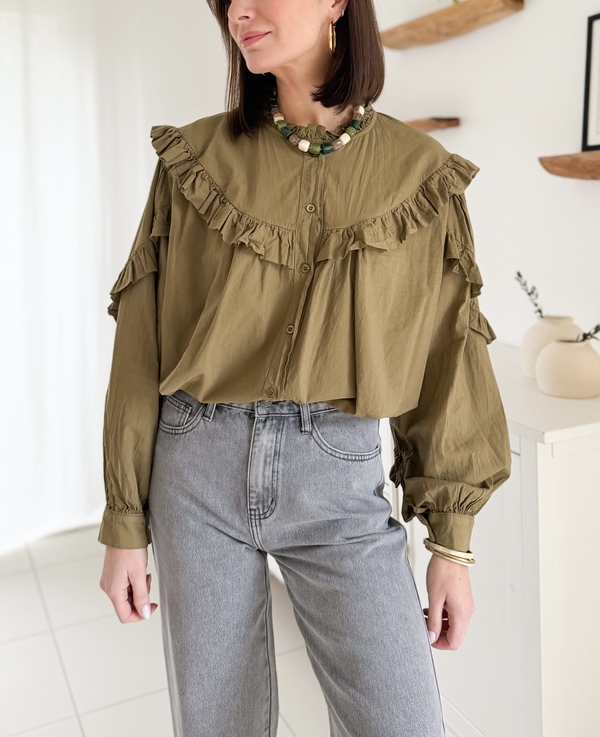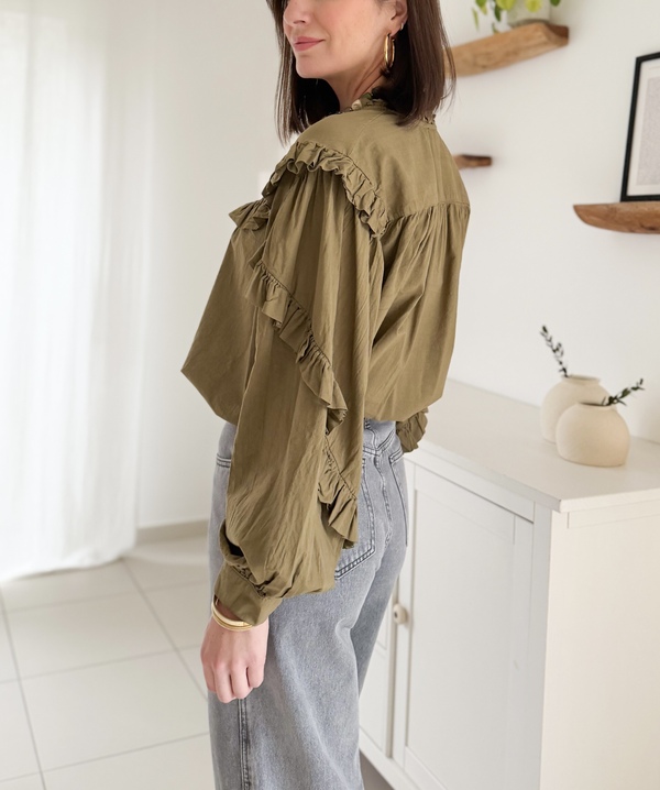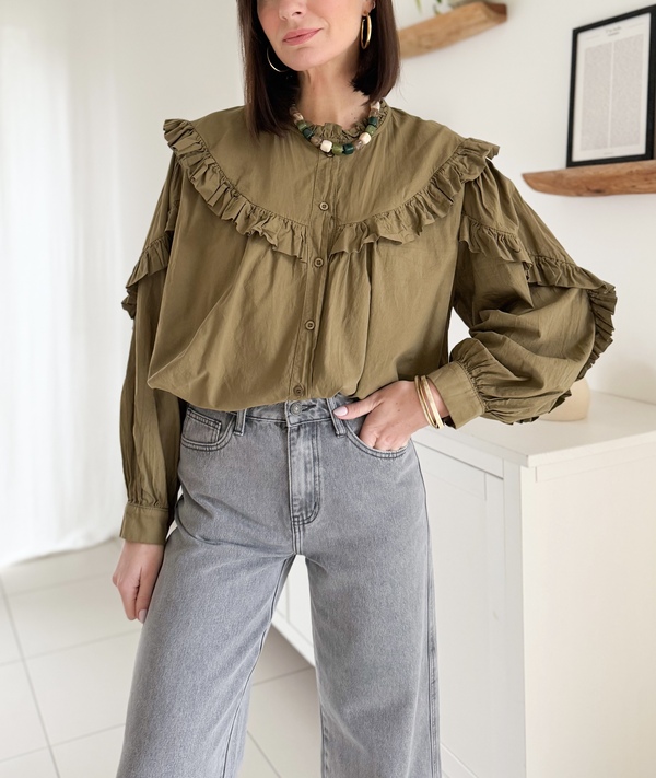 Chemise oversize kaki Col volanté Volants sur le décolleté et en milieu de manches Manches longues