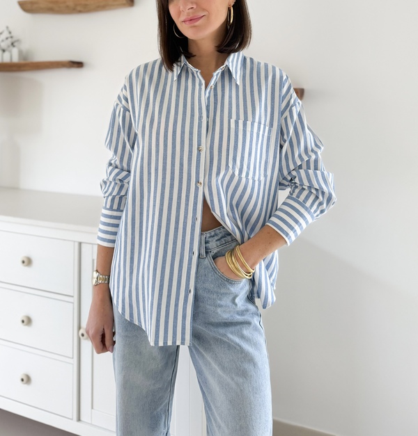Chemise rayée bleue Poche plaquée avant gauche Col rond Manches longues Fermeture à boutons sur le devant Coupe oversize