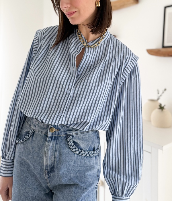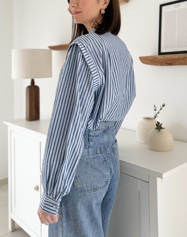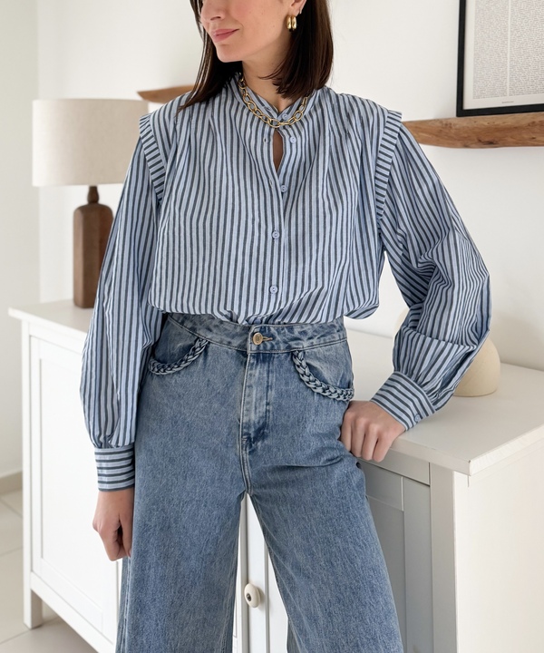 Chemise à rayures bleues Encolure ronde Empiècement sur les épaules Plissé sur le devant Manches longues
