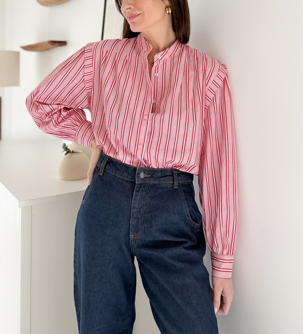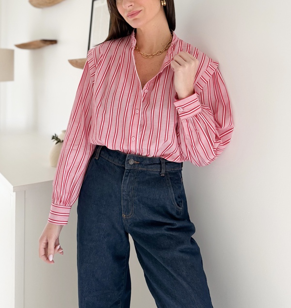 Chemise à rayures rouges Encolure ronde Empiècement sur les épaules Plissé sur le devant Manches longues