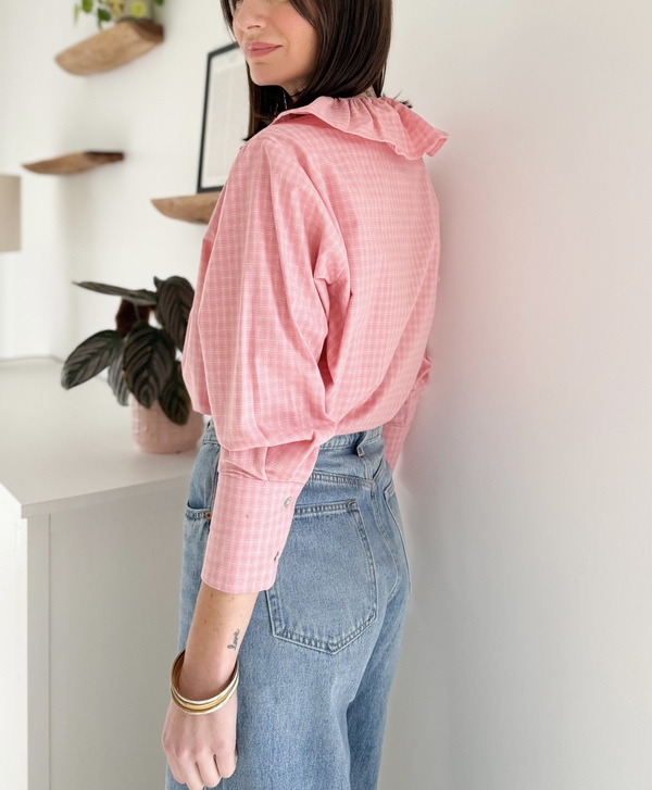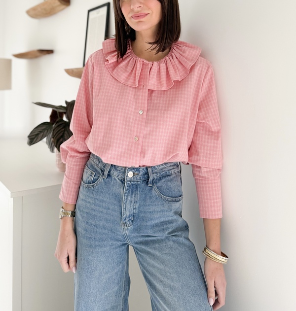 Chemise rose à carreaux Col claudine à volant Manches longues