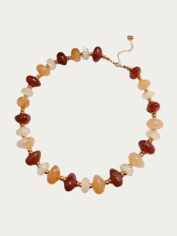 Collier en résine beige et marron Longueur 39 cm + 5 cm d’extension ; Fermoir et chainette en acier inoxydable.