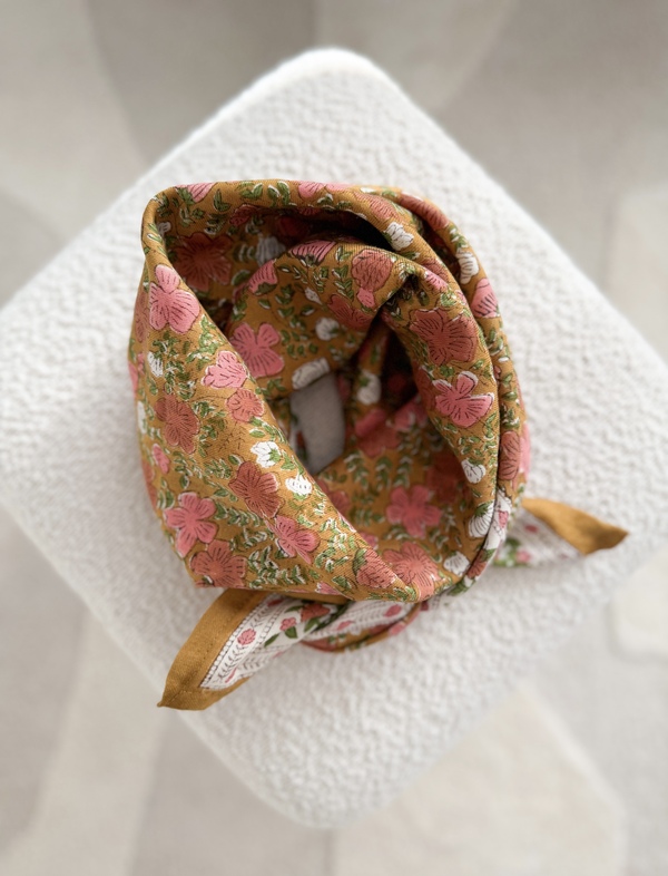 Foulard dessiné par Bellemme, imprimé et réalisé en Inde grâce à la technique du block Print, véritable savoir-faire ancestral.