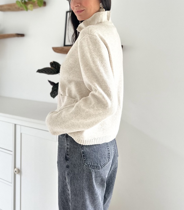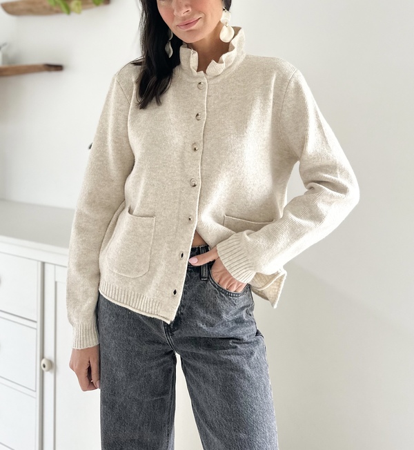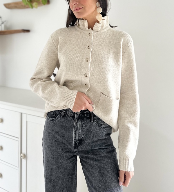 Gilet en maille écru Col montant à volant Boutons nacrés Manches longues Poches sur le devant