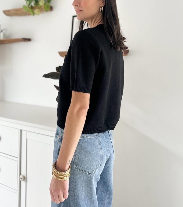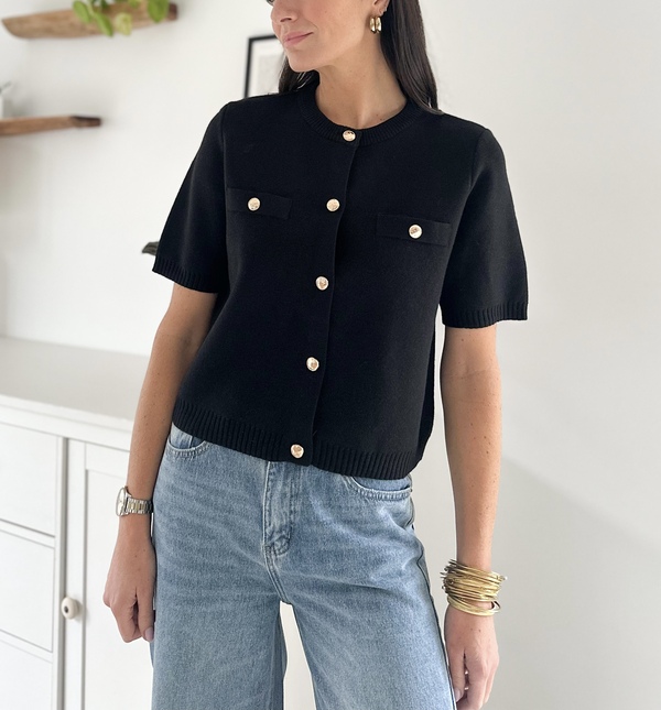 Gilet noir Manches courtes Fermeture à boutons dorés sur le devant Poches sur le devant Col rond Coupe oversize