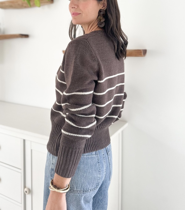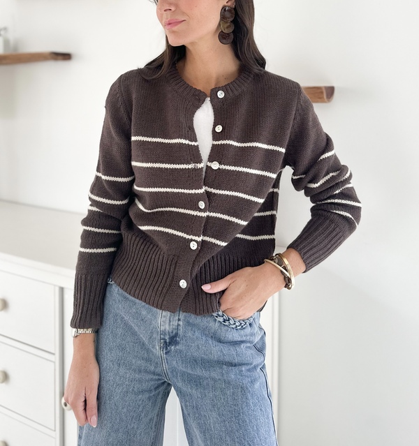 Gilet en maille marron Rayures écrues Col rond Boutons nacrés Manches longues resserrées aux poignets