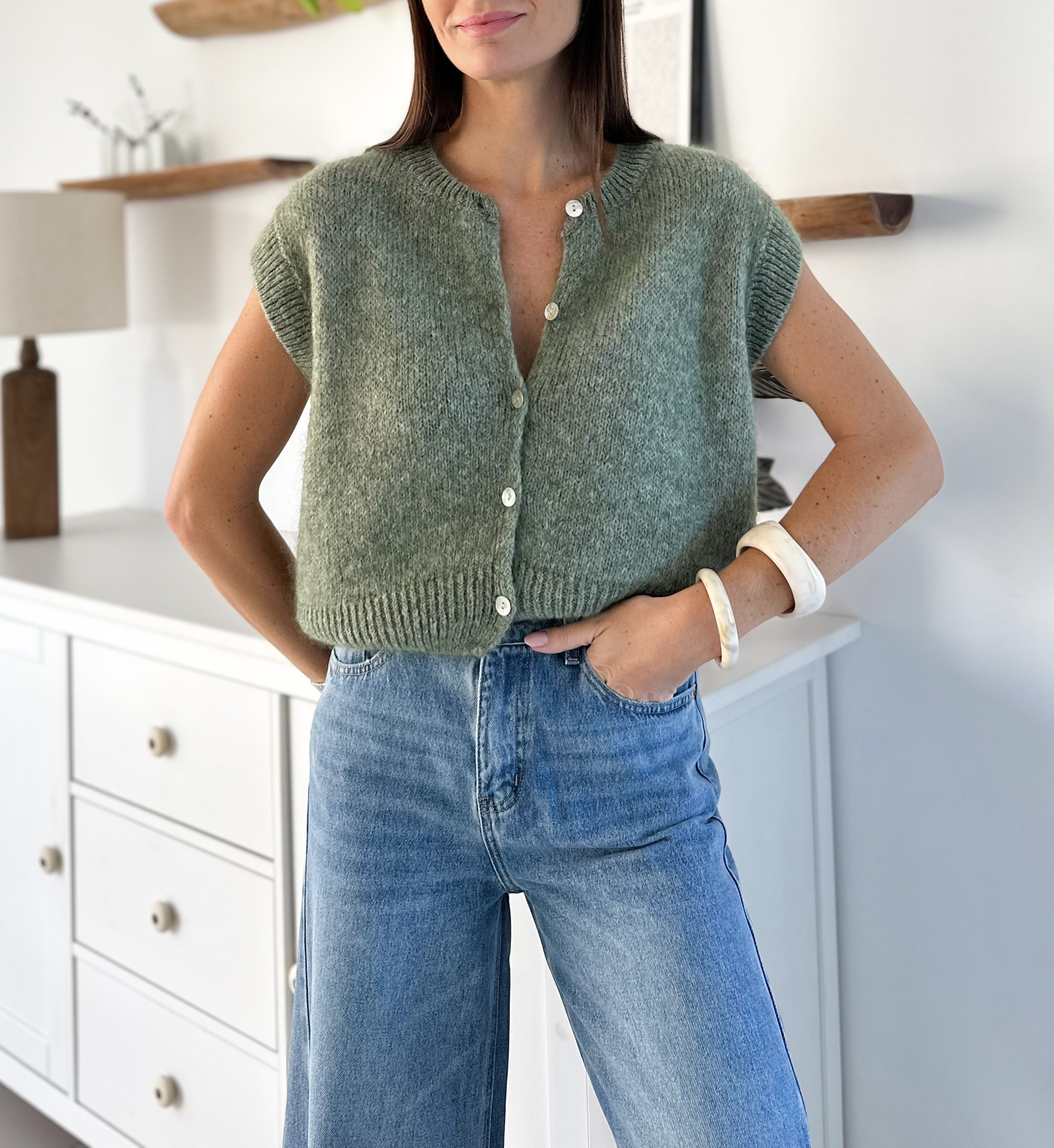Gilet en maille sans manchesEncolure rondeEntièrement boutonnéCouleur kaki