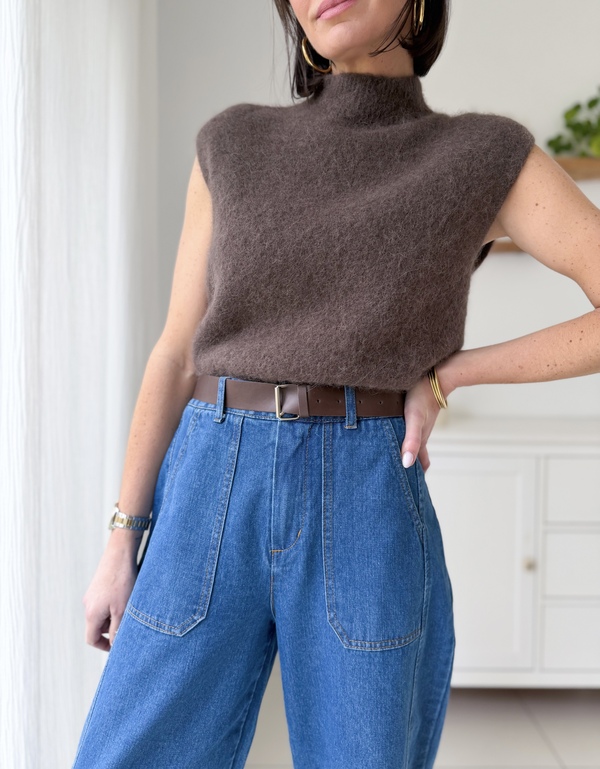 Jeans coupe barrel bleu Taille haute Fermeture éclair et bouton à l’avant Passants pour ceinture, ceinture incluse