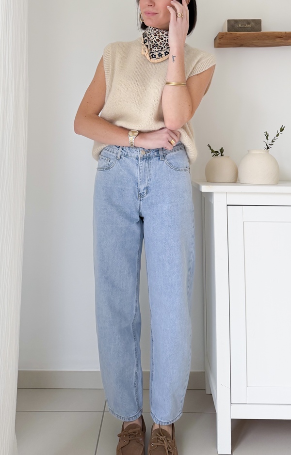 Jeans bleu 5 poches Fermeture par zip et bouton Passants pour ceinture Taille Haute Coupe Barrel : jambe effet ballon
