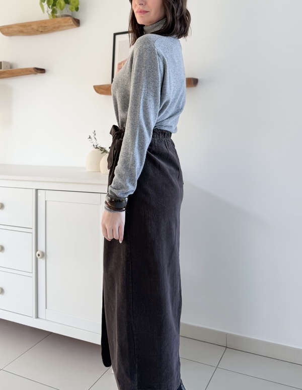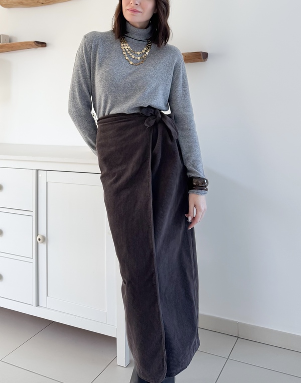 Jupe longue portefeuille Velours côtelé marron chocolat À nouer sur le côté