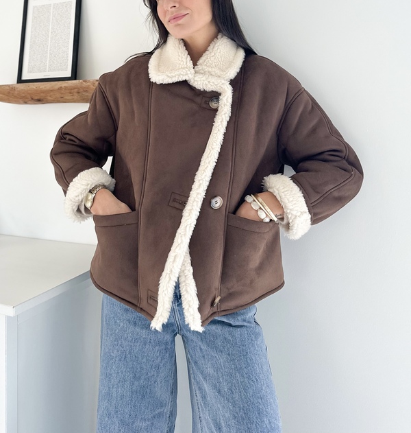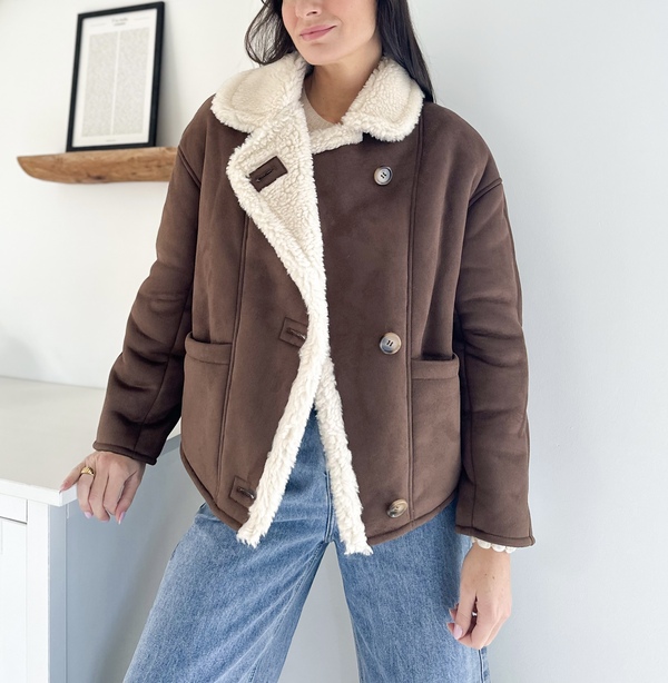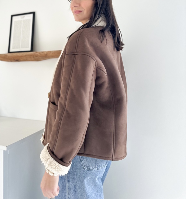 Manteau fausse peau retournée suédine marron Intérieur en fausse fourrure écrue Ouverture croisée et boutonnée sur le devant Poches plaquées