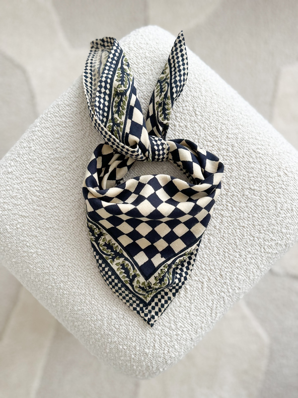 Foulard dessiné par Bellemme, imprimé et réalisé en Inde grâce à la technique du block Print, véritable savoir-faire ancestral.