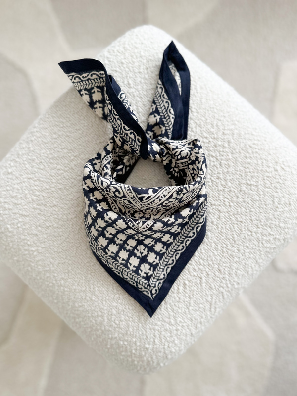 Foulard dessiné par Bellemme, imprimé et réalisé en Inde grâce à la technique du block Print, véritable savoir-faire ancestral.
