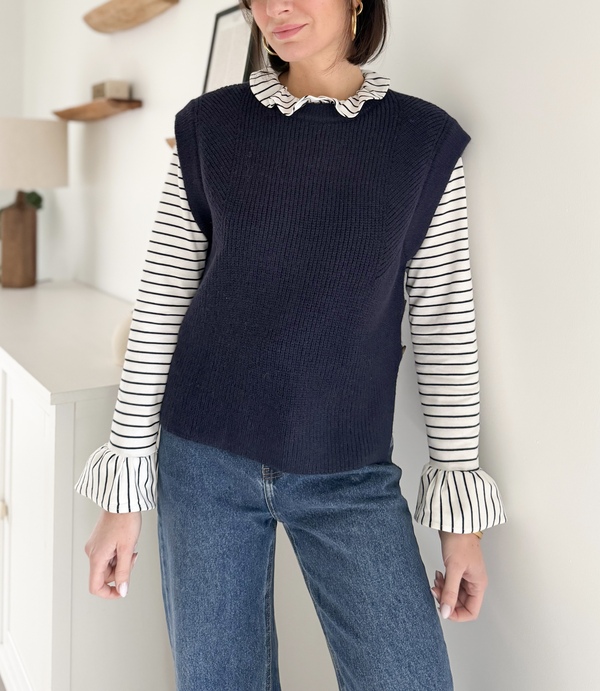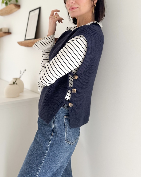 Pull en maille sans manches bleu marine Fente et boutons sur les côtés Encolure ronde