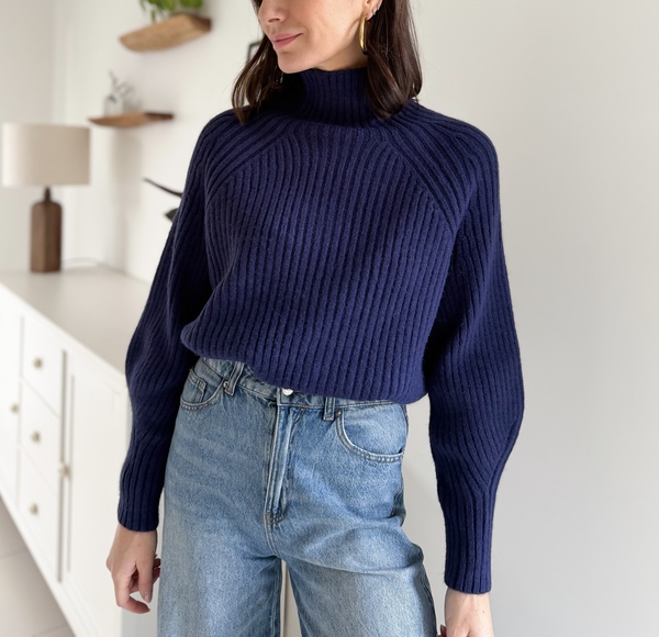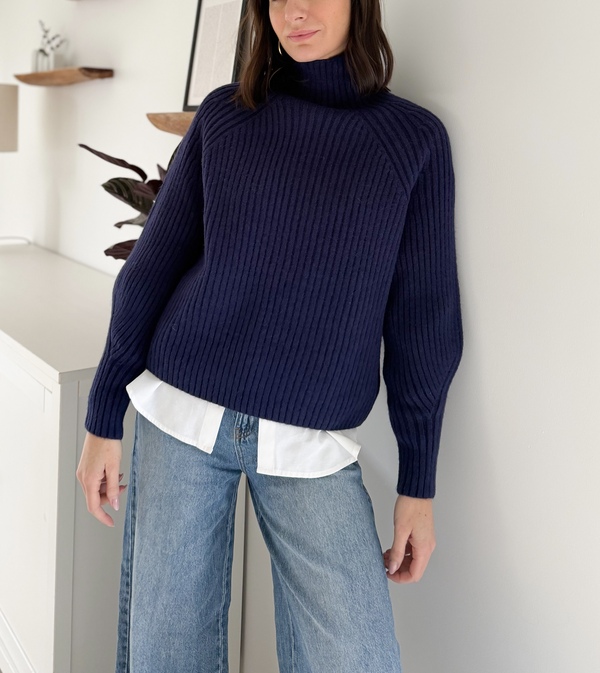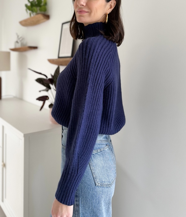 Pull en maille côteléeColoris bleu marineCol montantManches longuesResserrées aux poignets