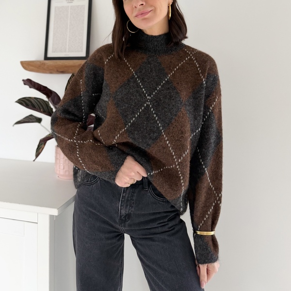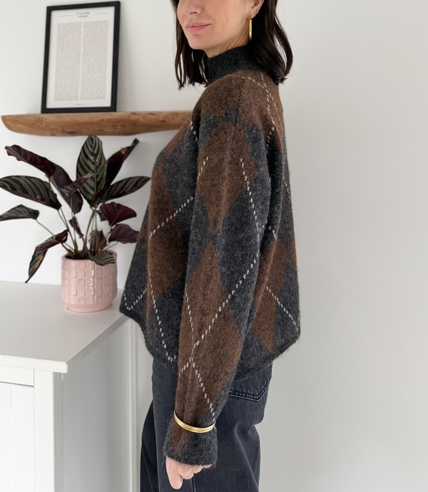 Pull Jacquard en maille Coloris gris et chocolat Col montant