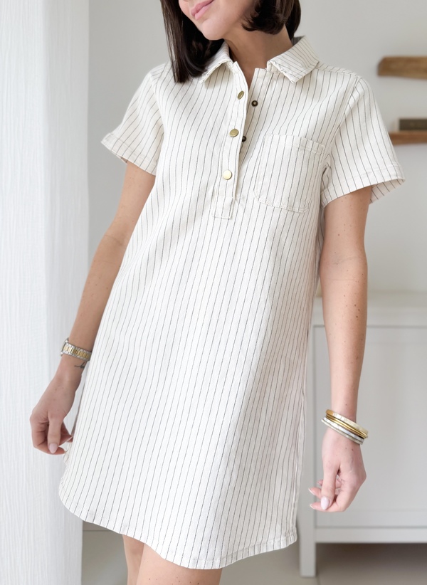 Robe rayée courte Col classique Poches sur le coté gauche Manches courtes Fermeture boutonnée