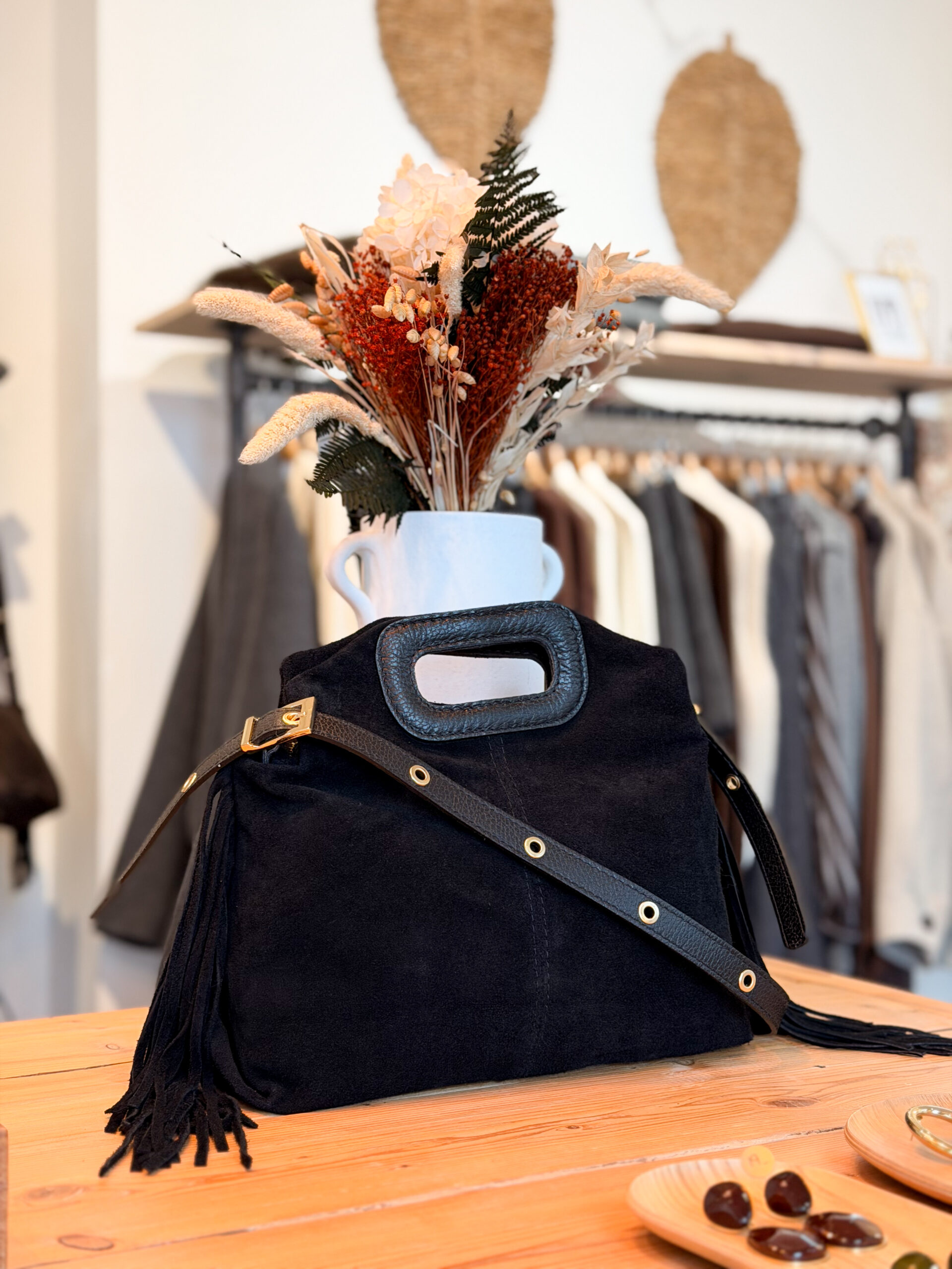 Sac en crôute de cuir noir Fermeture à glissière Anse ornée d’œillets Poche plaquée avec fermeture à glissière à l’intérieur