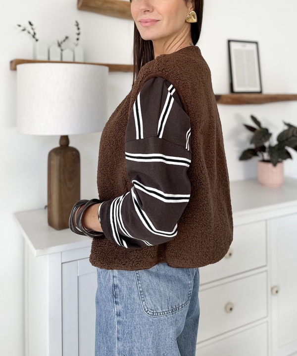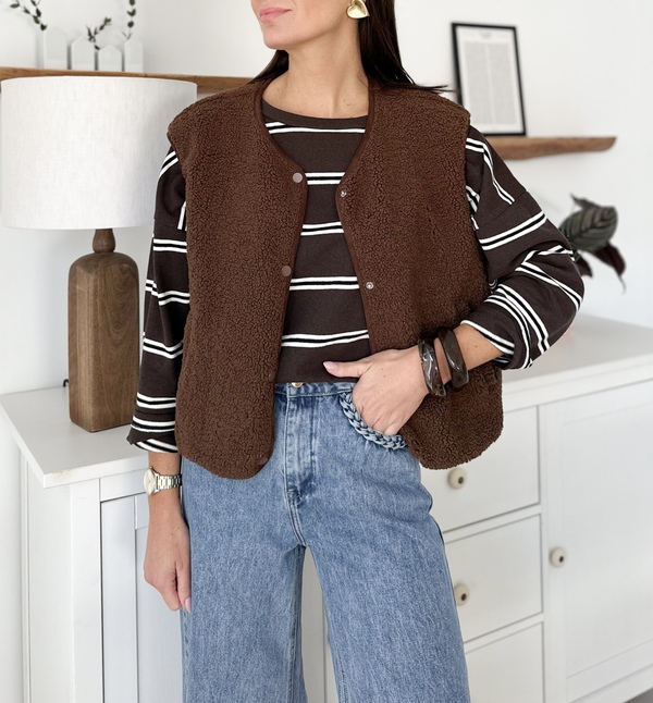 Veste sans manches marron chocolat Encolure ronde Imitation fourrure mouton Poches sur les côtés