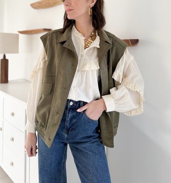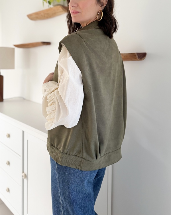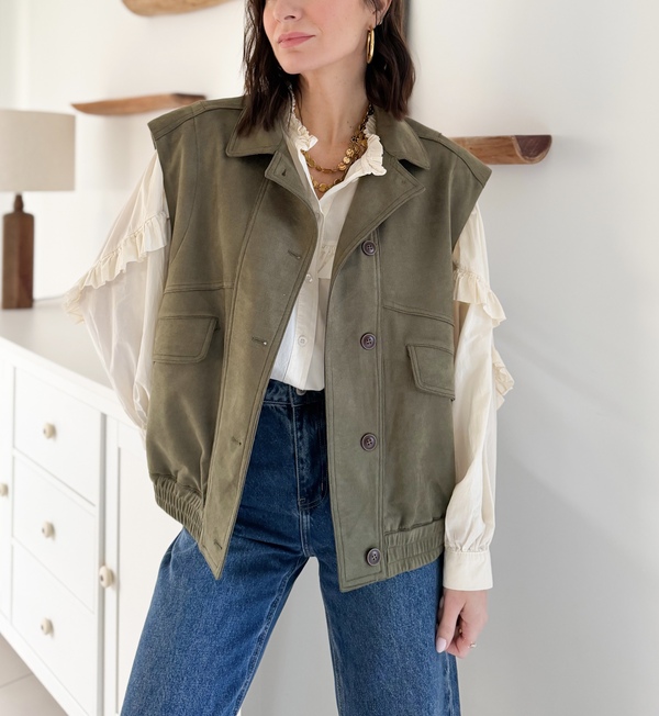 Veste sans manches oversize Suédine kaki 2 poches Entièrement boutonné